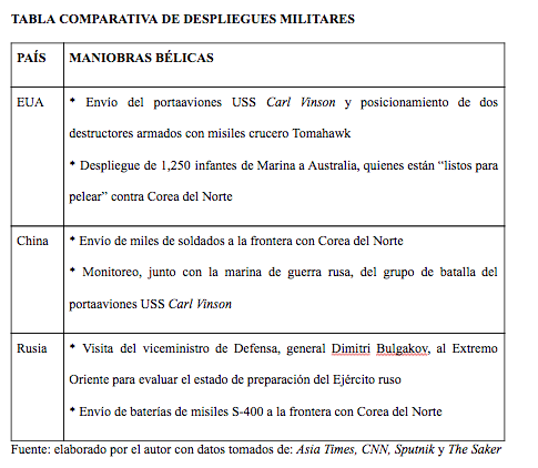 Envalentonado por su acción bélica en Siria y Afganistán y por la reunión con el presidente de China, Xi Jinping, Trump ha efectuado despliegues militares, los cuales han sido replicados por China y Rusia. Todo ello ha aumentado la temperatura.