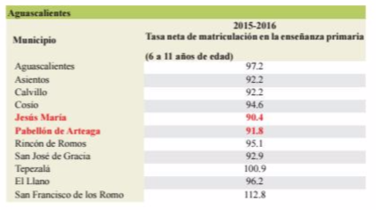 - En cuanto a la cobertura de instrucción primaria, la Tasa neta de matriculación en la enseñanza primaria (6 a 11 años de edad) en el estado de Aguascalientes es de 96.3%. Pero, preocupan los datos correspondientes a los municipios de Jesús María y Pabellón de Arteaga, ubicados en 90.4 y 91.8% respectivamente.