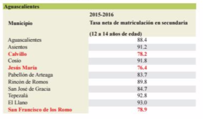 - El objetivo se encuentra en asegurar que para el año 2022, todos los jóvenes de 12 años de edad, de todos los municipios, ingresen a la enseñanza secundaria, que la cohorte 12-14 años reciba la enseñanza secundaria y que el 90 por ciento de ésta la concluya en el tiempo normativo (tres años). Preocupan la Tasa neta de matriculación en secundaria (12 a 14 años de edad) de los municipios de Calvillo (78.2%), Jesús María (76.4%) y San Francisco de los Romo (78.9%) que presentan menor cobertura.