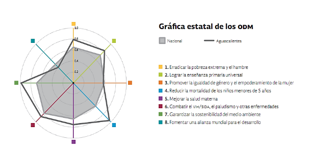 Se toma como punto de partida los Objetivos del Milenio de las Naciones Unidas (Odem), en los que Aguascalientes obtuvo un sexto lugar nacional, que dan cuenta de tener fortalezas importantes en: materia de medio ambiente, reducción de la mortalidad infantil, disminución de la pobreza y ofrecer mayor cobertura de la enseñanza primaria universal; por el otro lado muestra carencias aún por debajo del promedio nacional en materias como fomentar alianzas para el desarrollo o promover la igualdad de género.