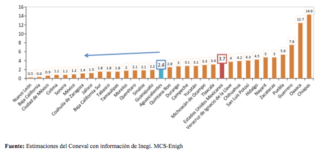 Aguascalientes es el número 14 en proporción de la población con ingresos per cápita inferiores a 1.25 dólares diarios (PPC. Paridad de Poder de Compra respecto al dólar) con el 2.4% de su población, contra el 3.7 del país, 0.05% de Nuevo León y 14.6% de Chiapas. En el 2008 Aguascalientes presentaba un 3.2% y bien podría aspirar a contar con sólo un 1.4%, como ahora Coahuila, al 2022.