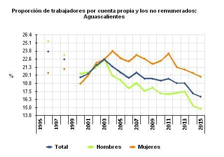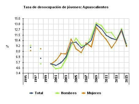 Otro de los principales objetivos es el de lograr un empleo pleno y productivo, y trabajo decente para todos, incluyendo mujeres y jóvenes; se trata de reducir la relación entre ocupación y población en edad de trabajar y la proporción de trabajadores por cuenta propia sin calificación alguna y a los no remunerados; la tasa de desocupación juvenil (asumiendo a los jóvenes de 15 a 24 años) asciende en Aguascalientes a 9.3 y es mayor entre los hombres (9.4%) que entre las mujeres (9.1%). Lo que se trata de promover son cuenta propia calificados; es decir, con capacidades certificadas y necesarias para el mercado laboral, como en el caso de Aguascalientes, los soldadores, las costureras, los electricistas y otros artes y oficios.