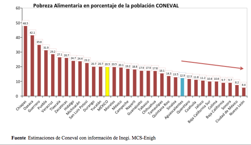- De buscar atender alguna de las vulnerabilidades prioritarias con premura, tendríamos la de reducir a la mitad la proporción de personas en pobreza alimentaria. Aguascalientes debería aspirar rumbo al 2022 a los niveles de Nuevo León, donde sólo el 6.4% se encuentra en pobreza alimentaria, toda vez que en dos años la entidad hidrocálida, logró reducir la población en pobreza alimentaria de un 14.9% al 12.9% . Es decir, en un dos por ciento. Es una meta ambiciosa, pero factible, la de reducir a la mitad este flagelo. En Chiapas, aún ahora, cerca de la mitad de la población la padece.