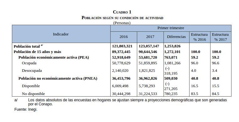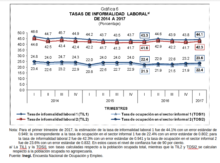 La Población Subocupada llegó a 3.7 millones de personas. Con cifras desestacionalizadas, la Tasa de Subocupación no presentó variación respecto al trimestre inmediato anterior. La Población Ocupada Informal, que agrupa todas las modalidades de empleo informal (sector informal, trabajo doméstico remunerado de los hogares, trabajo agropecuario no protegido y trabajadores subordinados que aunque trabajan en unidades económicas formales, lo hacen en modalidades fuera de la seguridad social) sumó 29.7 millones de personas. Mientras que la Tasa de Informalidad Laboral 1 registró un aumento de 0.3 puntos porcentuales en el primer trimestre de 2017 respecto al trimestre anterior.