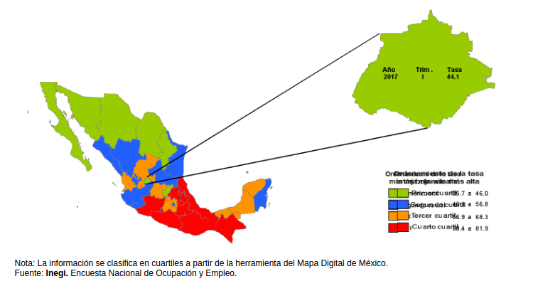 En el primer trimestre de 2017, la Tasa de Informalidad Laboral 1 (TIL1) de Aguascalientes (44.1%) se sitúa en el primer cuartil, en conjunto con Baja California, Baja California Sur, Coahuila de Zaragoza, Chihuahua, Nuevo León, Sonora y Querétaro, estas entidades se ubican en un rango de la TIL1 que va de 35.7 a 46%, respecto al total de la población ocupada.
