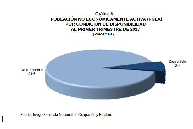 La población no económicamente activa (PNEA) agrupa a las personas que no participan en la actividad económica, ni como ocupados ni como desocupados. Durante el primer trimestre del año 2017, en la entidad, el 91.6% de la PNEA no estaban disponibles para trabajar, es decir, la perspectiva laboral queda totalmente fuera de su ámbito de interés por estar dedicada a estudiar, a las labores del hogar, jubilada y pensionada o incapacitada para trabajar y 8.4% declararon tener alguna disposición para trabajar (Gráfica 8).