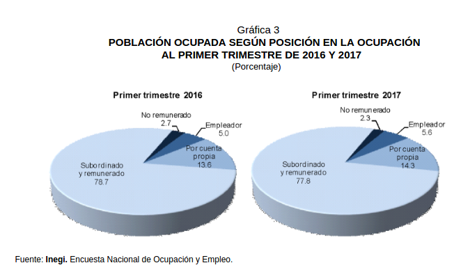 Entre los primeros trimestres de 2016 y 2017, la población que trabaja por cuenta propia y los empleadores, muestran un incremento en su participación de 0.7 y 0.6 de punto porcentual en cada caso, mientras que subordinados y remunerados y los no remunerados disminuyeron su participación en 0.9 y 0.4 de punto porcentual, respectivamente (Gráfica 3).