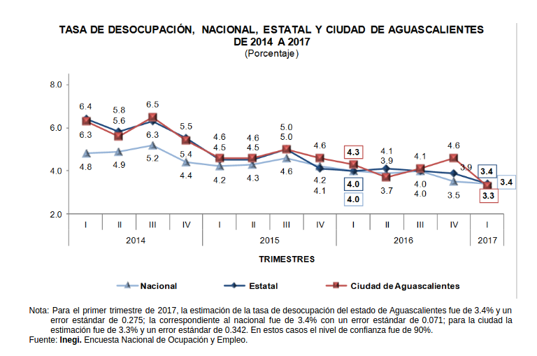 Nota: Para el primer trimestre de 2017, la estimación de la tasa de subocupación del estado de Aguascalientes fue de 1.7% y un error estándar de 0.252; la correspondiente al total nacional fue de 7.1% con un error estándar de 0.146 y para la ciudad la tasa fue de 1.7 y un error estándar de 0.269. En estos casos el nivel de confianza fue de 90%.