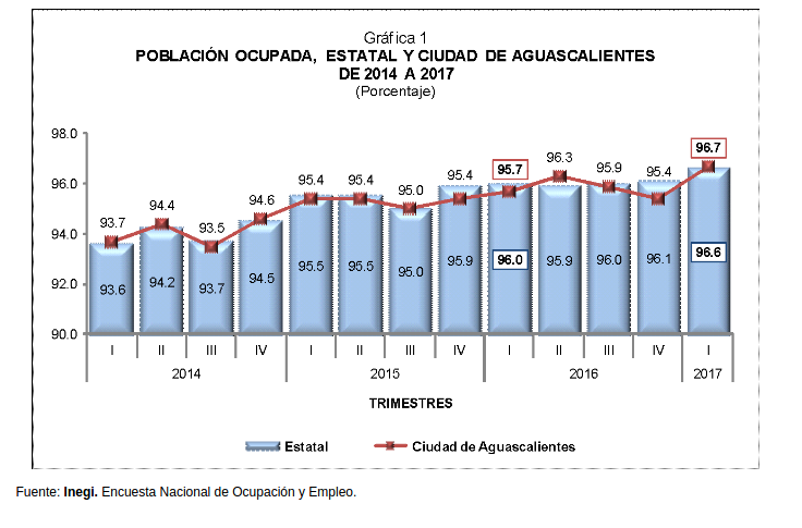 En el primer trimestre de 2017, de la población económicamente activa en la entidad 96.6% está ocupada y para la ciudad de Aguascalientes el dato es 96.7%. Comparado este porcentaje con el registrado en el mismo trimestre del año anterior, se observa que para la entidad el dato de la ocupación es mayor en 0.6 de punto porcentual y para la ciudad un punto porcentual (Gráfica 1).