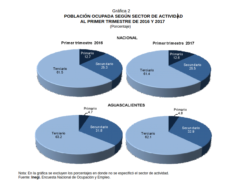 Entre el lapso enero-marzo de 2016 y el mismo periodo de 2017, en los porcentajes de la población ocupada por sector de actividad, se observa una disminución en la participación de la ocupación en el sector terciario al pasar de 63.2 a 62.1%, mientras que en el primario y secundario se incrementan al pasar de 4.7 a 4.8 y de 31.8 a 32.9%, respectivamente.