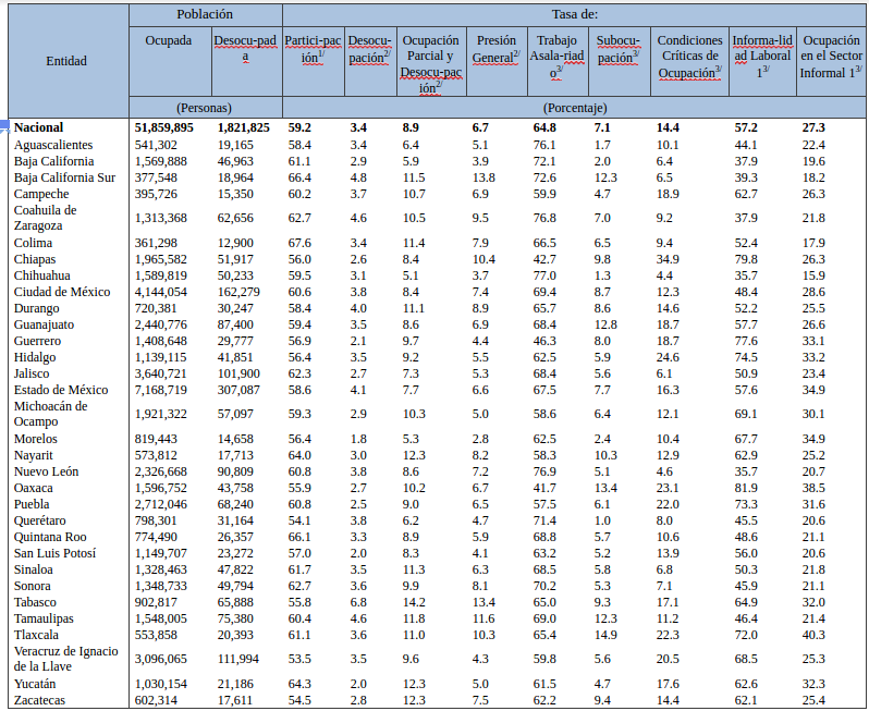 Las entidades federativas que tienen las mayores tasas de participación en la actividad económica (cociente entre la PEA y la población de 15 o más años de edad) son: Colima con 67.6%, Baja California Sur 66.4%, Quintana Roo 66.1%, Yucatán 64.3%, Nayarit 64%, Coahuila de Zaragoza y Sonora 62.7% de manera individual y Jalisco con 62.3 por ciento. Congruentes con el tamaño de su población, el estado de México y Ciudad de México constituyen los mercados de trabajo más grandes del país, con 7.2 y 4.1 millones de personas ocupadas, en ese orden, y representan en conjunto el 21.8% del total nacional; les siguen Jalisco con 3.6 millones, Veracruz de Ignacio de la Llave 3.1 millones, Puebla 2.7 millones, Guanajuato 2.4 millones, Nuevo León 2.3 millones y Chiapas con 2 millones de personas. En el otro extremo y obedeciendo a su estructura poblacional se encuentran las entidades con los menores tamaños del mercado laboral: Colima con 361 mil personas, Baja California Sur 378 mil, Campeche 396 mil, Aguascalientes 541 mil, Tlaxcala 554 mil y Nayarit con 574 mil ocupados.