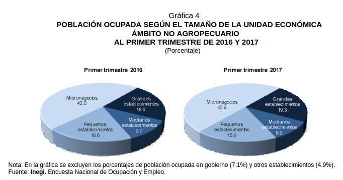 Entre los primeros trimestres de 2016 y 2017, la población ocupada en los medianos y pequeños establecimientos, disminuyeron en 0.8 y 0.7 de punto porcentual respectivamente, por el contrario, los micronegocios y los grandes establecimientos incrementaron en 1.9 y 0.7 de punto porcentual respectivamente (Gráfica 4).