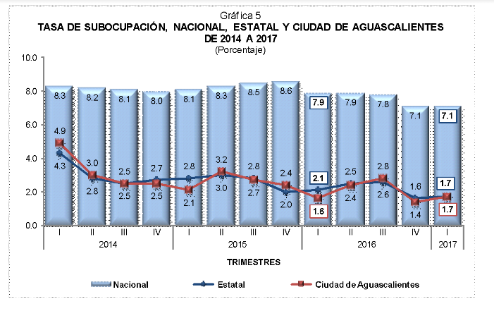 Durante enero-marzo de 2017, en el estado y en la ciudad de Aguascalientes, la tasa de subocupación respecto de la población ocupada fue de 1.7% respectivamente, valor que resulta inferior en 0.4 de punto porcentual para la entidad y superior en 0.1 de punto porcentual para la ciudad, del registrado durante el mismo periodo del año anterior (2.1 y 1.6% respectivamente). A nivel nacional, este indicador es de 7.1% para el primer trimestre de 2017, dato superior en 5.4 puntos porcentuales al registrado para la entidad y para la ciudad de Aguascalientes (Gráfica 5). En cuanto a la población subocupada, por sexo, en la entidad la mayor tasa de subocupación la representan los hombres con 1.8%, mientras que las mujeres en esta condición, es de 1.5 por ciento.