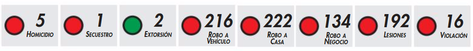 El Semáforo Delictivo reportó con base en denuncias presentadas a las agencias del Ministerio Público durante abril: un secuestro, dos extorsiones, cinco homicidios, 16 violaciones sexuales, 192 lesiones, 134 robos a negocio, 216 vehiculares y 222 domiciliarios.