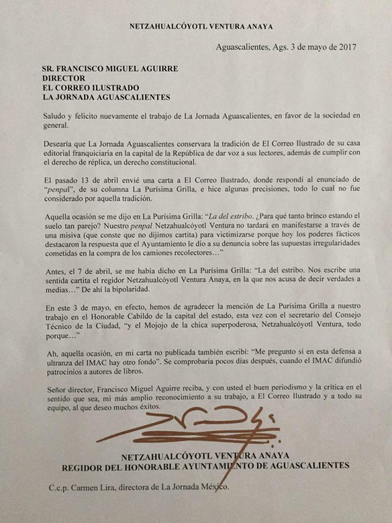 Todo lo que ha mandado a este diario, destinado a la sección Correo ilustrado, se ha publicado, en alguna ocasión, a petición suya respetando “su formato”, aunque así quedara en evidencia su deficiente redacción y los errores ortográficos con que salpimienta sus frases. Así que es falsa su pomposa acusación de que sus precisiones no fueron consideradas “por aquella tradición”. Le hace falta leer más La Jornada Aguascalientes.