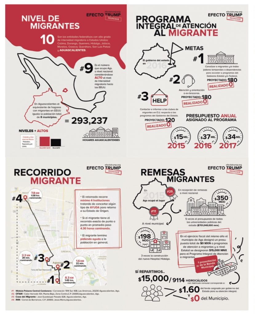 Para el Programa Integral de Atención al Migrante, el gobierno estatal presupuestó 15 mil pesos en 2015, 37 mil en 2016 y 34 mil en 2017, lo que quiere decir que si deportaran tan sólo a los connacionales que cuentan con matrícula consular, el estado destinaría 3.72 pesos a su retorno. En 2015, hubieran sido 1.60 pesos por parte del estado y cero pesos del municipio, que no tiene recursos etiquetados para tal fin,  “Subieron la cafetería de oficinas pero recortaron los programas de migrantes”.