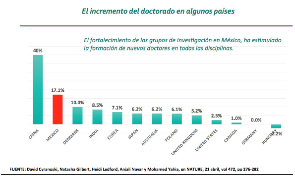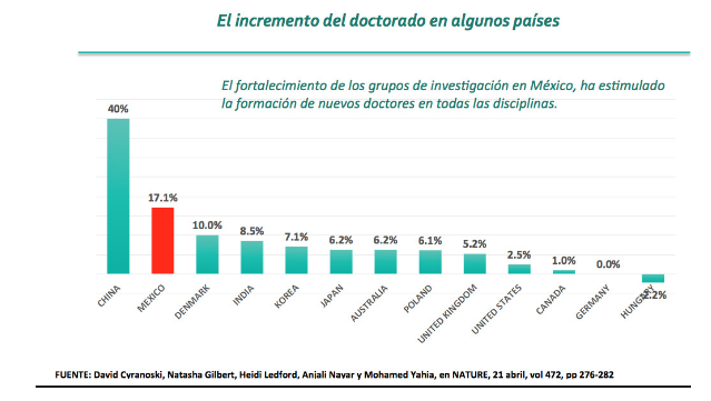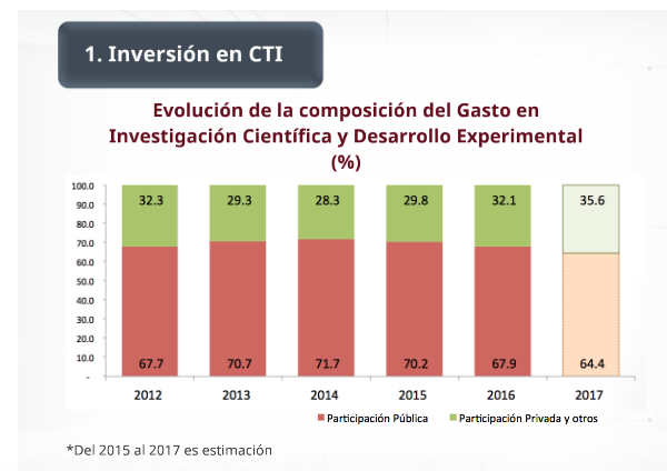 En tanto, en México ocurre lo contrario, 67.9 por ciento de la inversión la hace el gobierno y la iniciativa privada sólo participa con 32.1 por ciento, según datos presentados recientemente por el titular del Conacyt, Enrique Cabrero Mendoza.
