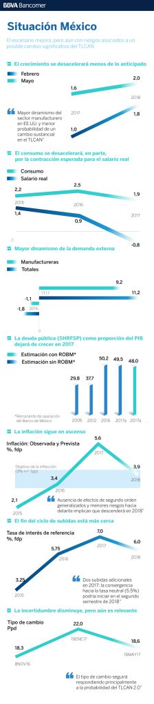 De acuerdo al Servicio de Estudios Económicos de BBVA Bancomer se estima que el panorama para México es más positivo, pero aún con riesgos. Se consolida la mejora del entorno global y se acotan las incertidumbres. Se espera una ligera aceleración del crecimiento global y una menor desaceleración del crecimiento en México, en comparación con las últimas previsiones, destaca el informe Situación México, correspondiente al segundo trimestre del 2017.