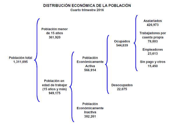 A finales del 2015 el estado de Aguascalientes contaba con una población económicamente activa PEA = 541 mil 469 pero se encontraban en realidad ocupados 517 mil 336 y el resto (4.66%) o 24 mil 133 estaban desocupados. Un año después, la PEA aumentó 25 mil 445 efectivos y los ocupados sumaron 27 mil 503 adicionales, lo que representa un aumento considerable.