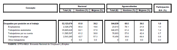 La población económicamente activa (PEA) del estado, la reportan con 566 mil 914 efectivos, de la cual la mayoría 544 mil 839 se encuentran ocupados; predominan los asalariados con 426 mil 973. Se ha generalizado en Aguascalientes buscar un trabajo en el que se dependa del empleador, independientemente de su preparación o situación financiera, pero el empresariado no aumenta. De hecho, los empleadores se redujeron de más de 28 mil a 23 mil 613 y los “cuenta propia” se incrementaron, hasta sumar 78 mil 803.