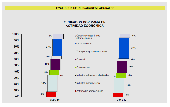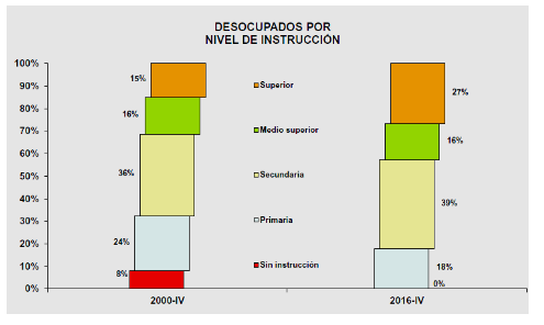 Por escolaridad o nivel de instrucción, en los últimos 17 años se ha venido modificando sustantivamente el perfil del desempleado: el 43% ya cuenta con estudios de educación media o superior (contra tres de cada diez en el año 2000) cuatro de cada diez desocupados tienen instrucción secundaria y sólo dos de cada diez cuentan con primaria o están sin instrucción, cuando en el 2000 superaban el 30%.