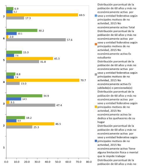 Aguascalientes: Distribución porcentual de la población de 60 años y más no económicamente activa por sexo, según principales motivos de no actividad, 2015