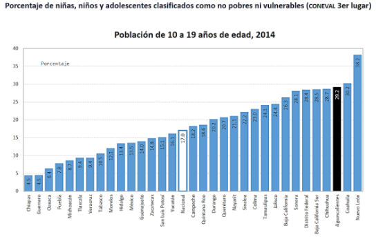 Es notable que Aguascalientes comparta los últimos lugares con la Ciudad de México, Jalisco y Guanajuato; dado que, entre ellos, los valores de participación juvenil y bienestar pueden bajar a niveles muy reducidos, aunque puedan encontrarse entre los primeros lugares en materia de jóvenes no pobres ni vulnerables.