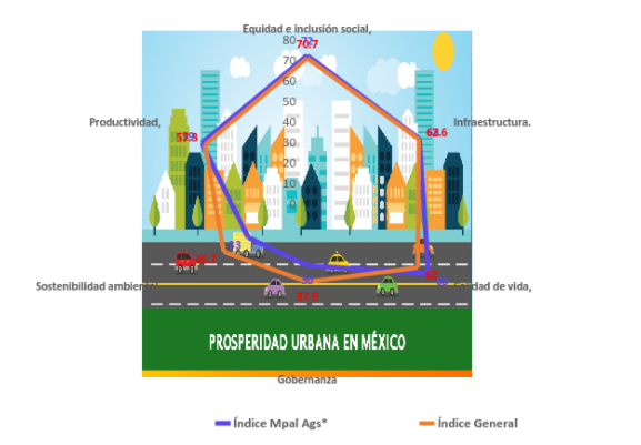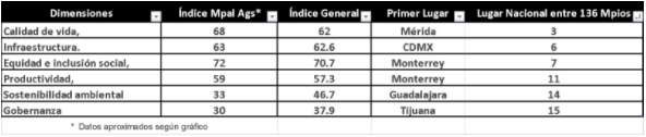 Los valores más altos (siendo aún bajos) entre el conjunto de ciudades mexicanas y en Aguascalientes se encuentra en los rubros de equidad e inclusión social; se reducen los valores en infraestructura y calidad de vida. Son aún menores, en productividad, medio ambiente y particularmente en gobernanza, que para Aguascalientes suma sólo 30/100 puntos.