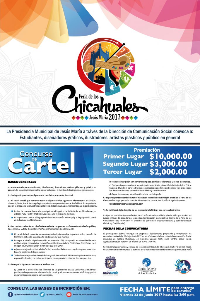 La presidencia de Jesús María a través de la Dirección de Comunicación Social y el Comité de la Feria de los Chicahuales, invitan a estudiantes, ilustradores, artistas plásticos y al público en general al concurso del diseño del cartel de la feria que lleva el mismo nombre en su edición 2017.