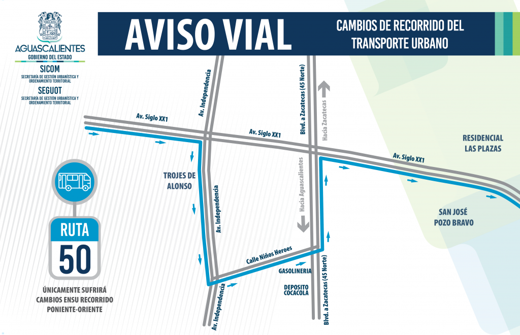 A usuarios de camiones urbanos de la ruta 50, que abordan en el cruce de Siglo XXI norte y carretera 45, se les comunica que se  recorrerá la parada al cruce de Siglo XXI norte con Independencia.
