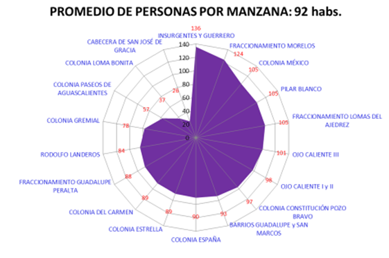 En una veintena de estas demarcaciones, se pueden tener medio millón de residentes en Aguascalientes. Algunas de ellas con colonias más pobladas que sus vecinas, como es el caso de Loma Bonita y los desarrollos aledaños de Canteras, lo que propicia que el promedio a la redonda sea muy bajo. El caso contrario, lo tenemos en la colonia Rodolfo Landeros, donde su densidad de población es tan alta como la de sus vecinos. Así, en el mismo círculo de dos kilómetros de diámetro se localizan más de 40 mil habitantes, población semejante al total de los residentes del municipio de San Francisco de los Romo.