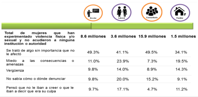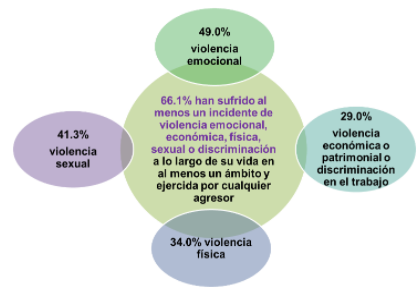 En el ámbito nacional, el 66.1% de las mujeres ha sufrido al menos un incidente de violencia a lo largo de su vida. El 49% de las mujeres sufrió violencia emocional, 29% violencia económica–patrimonial o discriminación, 34% física y 41.3% sexual a lo largo de su vida en al menos un ámbito y ejercida por cualquier agresor.