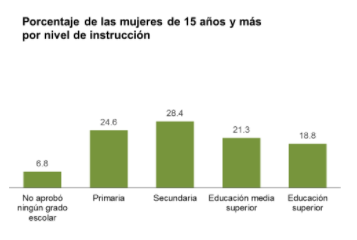 En cuanto a su nivel de instrucción, los resultados muestran que sólo el 18.8% contaban con educación superior. La mayoría de ellas, el 28.4%, tenían estudios de secundaria, el 24.6% de primaria y el 21.3% de educación media superior. Únicamente, el 6.8% no había aprobado ningún grado escolar.