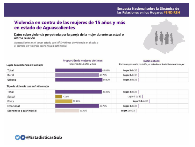 Diez entidades están por encima de la media nacional, tanto para la violencia total a lo largo de la vida, como para la violencia reciente ocurrida en los últimos 12 meses (octubre de 2015 a octubre de 2016): Ciudad de México, estado de México, Jalisco, Aguascalientes, Querétaro, Chihuahua, Yucatán, Durango, Coahuila de Zaragoza y Baja California.