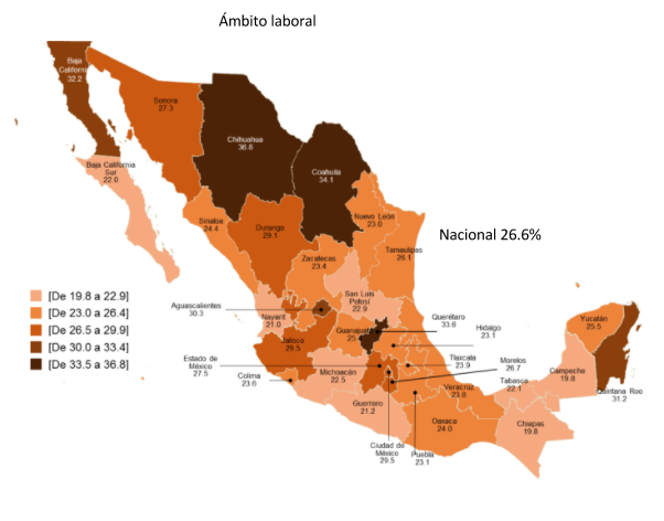 La prevalencia nacional de violencia en el ámbito laboral es de 26.6% y las entidades con las prevalencias más altas son: Chihuahua, Coahuila, Querétaro, Baja California y Quintana Roo.