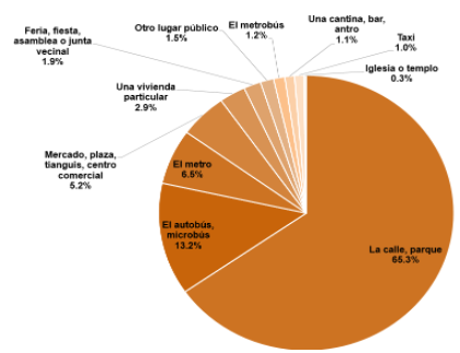 La violencia ejercida contra las mujeres en el ámbito comunitario en los últimos 12 meses, ocurrió principalmente en la calle y parques (65.3%) seguido del autobús y microbús (13.2%), metro (6.5%).