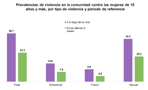 La prevalencia nacional de violencia comunitaria contra las mujeres es de 38.7% y las entidades con las prevalencias más altas son: Ciudad de México, Estado de México, Jalisco, Aguascalientes y Querétaro.