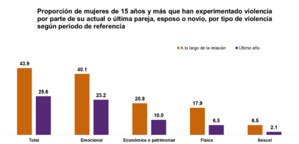 - 43.9% de las mujeres han sufrido violencia por parte de su actual o última pareja, esposo o novio, a lo largo de su relación