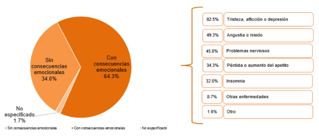 Para el 64.3% la violencia física y/o sexual ejercida por su pareja, le ha dejado consecuencias emocionales, a la mayoría tristeza o depresión; a la mitad angustia o miedo y para un tercio de ellas problemas alimenticios.