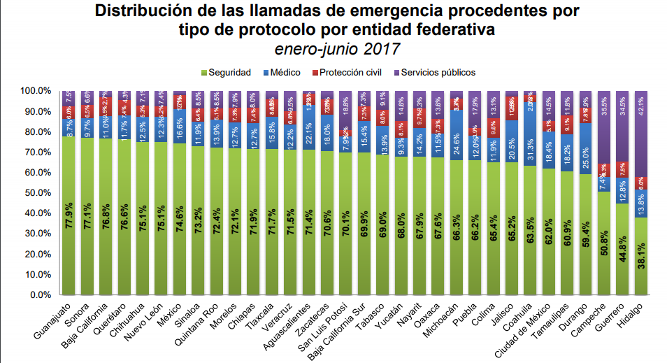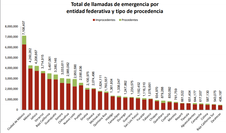Entre enero y julio de 2017, el 911 atendió 719 mil 677 llamadas telefónicas, de las cuales 565 mil 20 resultaron ser improcedentes, lo que representa el 78.5 por ciento del universo de telefonemas. De los 154 mil 657 reportes procedentes, 71.4 por ciento tienen que ver con seguridad pública; 22.1 por ciento, con atención médica; 1.2 por ciento, protección civil y 0.2 por ciento, con servicios públicos.