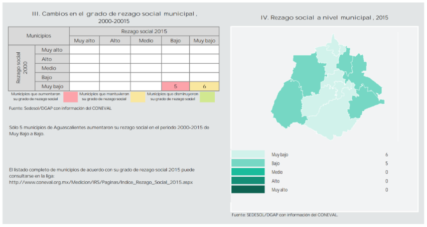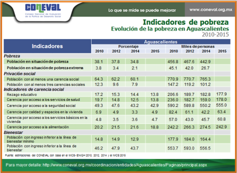 En el Informe Anual del Coneval sobre la Situación de la Pobreza y el Rezago Social en el estado de Aguascalientes y en sus municipios destaca: una consistente reducción del rezago educativo, la carencia por acceso a los servicios de salud y las carencias asociadas a la calidad, espacios y servicios básicos en la vivienda, en el periodo comprendido desde 1990 hasta el 2015.