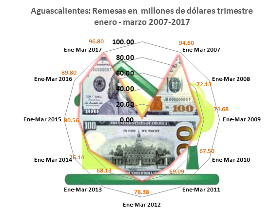 En el 2017, se están presentando los envíos de remesas más altos desde hace una década para un trimestre enero marzo por: 96.80 millones de dólares, o 1.075 millones de dólares diarios para el estado de Aguascalientes.
