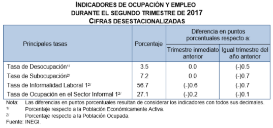 De acuerdo a la encuesta levantada por el Inegi, en el segundo trimestre del 2017, todas las modalidades de empleo informal sumaron 29.5 millones de personas, un aumento de 0.3% respecto a igual periodo del 2016 y representó 56.5% de la población ocupada. Unos 14.1 millones conformaron la ocupación en el sector informal, (27% de la población ocupada); 7.2 millones corresponden al ámbito de las empresas, gobierno e instituciones; 5.9 millones al agropecuario y otros 2.3 millones al servicio doméstico remunerado.