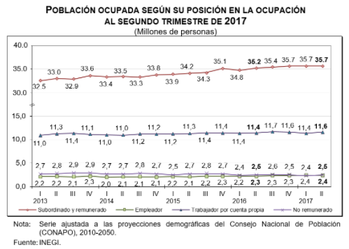 La población ocupada en función de la posición que guarda dentro de su trabajo, indica que poco más de dos terceras partes del total (68.3%), 35.7 millones son trabajadores subordinados y remunerados; 11.6 millones (22.3%) trabajan por su cuenta, sin emplear personal pagado; 2.5 millones (4.8%) son trabajadores que no reciben remuneración, y 2.4 millones (4.6%) son propietarios de los bienes de producción, con trabajadores a su cargo De las anteriores categorías se desprende que los trabajadores subordinados y remunerados se acrecentaron en 471 mil personas entre el segundo trimestre de 2016 e igual periodo de 2017, los trabajadores por cuenta propia aumentaron en 183 mil personas y los empleadores en 147 mil personas, en tanto que los ocupados que no perciben una remuneración por su trabajo se redujeron en ( )36 mil personas, en el periodo en cuestión.