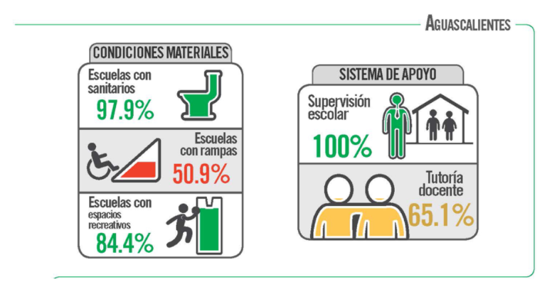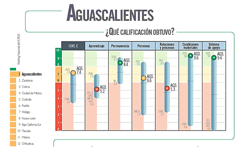 Aguascalientes obtiene tres calificaciones en verde: permanencia de los alumnos con 8.4/10; está en primeros lugares en condiciones materiales de las escuelas y en sistema de apoyo con 9.6 y 9.4/10. Las personas involucradas están evaluadas con 6.6 y el aprendizaje que se genera con un 5.2/10, En aprendizaje, el líder es Puebla, Aguascalientes es el número 12.