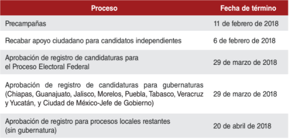 Respecto a los tiempos para los procesos electorales locales concurrentes con el Proceso Electoral Federal 2018, Ruelas Olvera detalló que el inicio de las precampañas federales será el 14 de diciembre próximo y agregó que el INE estableció las fechas para la conclusión de los siguientes procesos: