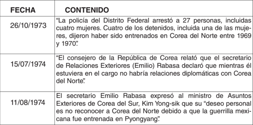 TABLA DE REVELACIONES DE LA INJERENCIA NORCOREANA EN MÉXICO