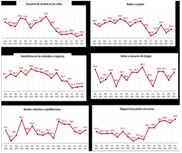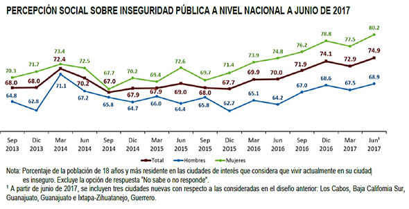 Desde hace dos años, la encuesta acusa una escalada ascendente. De hecho, durante el mes de junio de 2017, 74.9% de la población encuestada de 18 años y más consideró que vivir en su ciudad es inseguro, de acuerdo con los resultados del decimosexto levantamiento de la Encuesta. Siete puntos más que en septiembre del 2015.