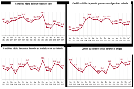 En Aguascalientes, el 39.5% de la población de 18 años y más, residente en la ciudad, manifestó que durante el segundo trimestre de 2017 modificó sus hábitos respecto a “llevar cosas de valor como joyas, dinero o tarjetas de crédito” por temor a sufrir algún delito; mientras que 36.1% reconoció haber cambiado hábitos respecto a “permitir que sus hijos menores salgan de su vivienda”; 34.1% cambió rutinas en cuanto a “caminar por los alrededores de su vivienda, pasadas las ocho de la noche” y 19% cambió rutinas relacionadas con “visitar parientes o amigos”.