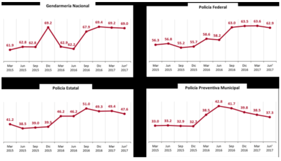 Nueve de cada diez confían en la Marina y en el Ejército; la confianza baja a siete de cada diez al tratarse de la Policía federal; seis de cada diez opinan lo mismo, pero sobre Policía estatal y al 53% les inspira confianza la Policía preventiva municipal.